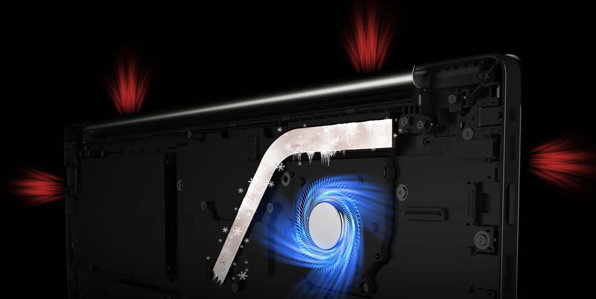 Большой кулер и четыре крупных вентиляционных отверстия обеспечивают эффективное рассеивание тепла, что положительно влияет на мощность работы ноутбука.