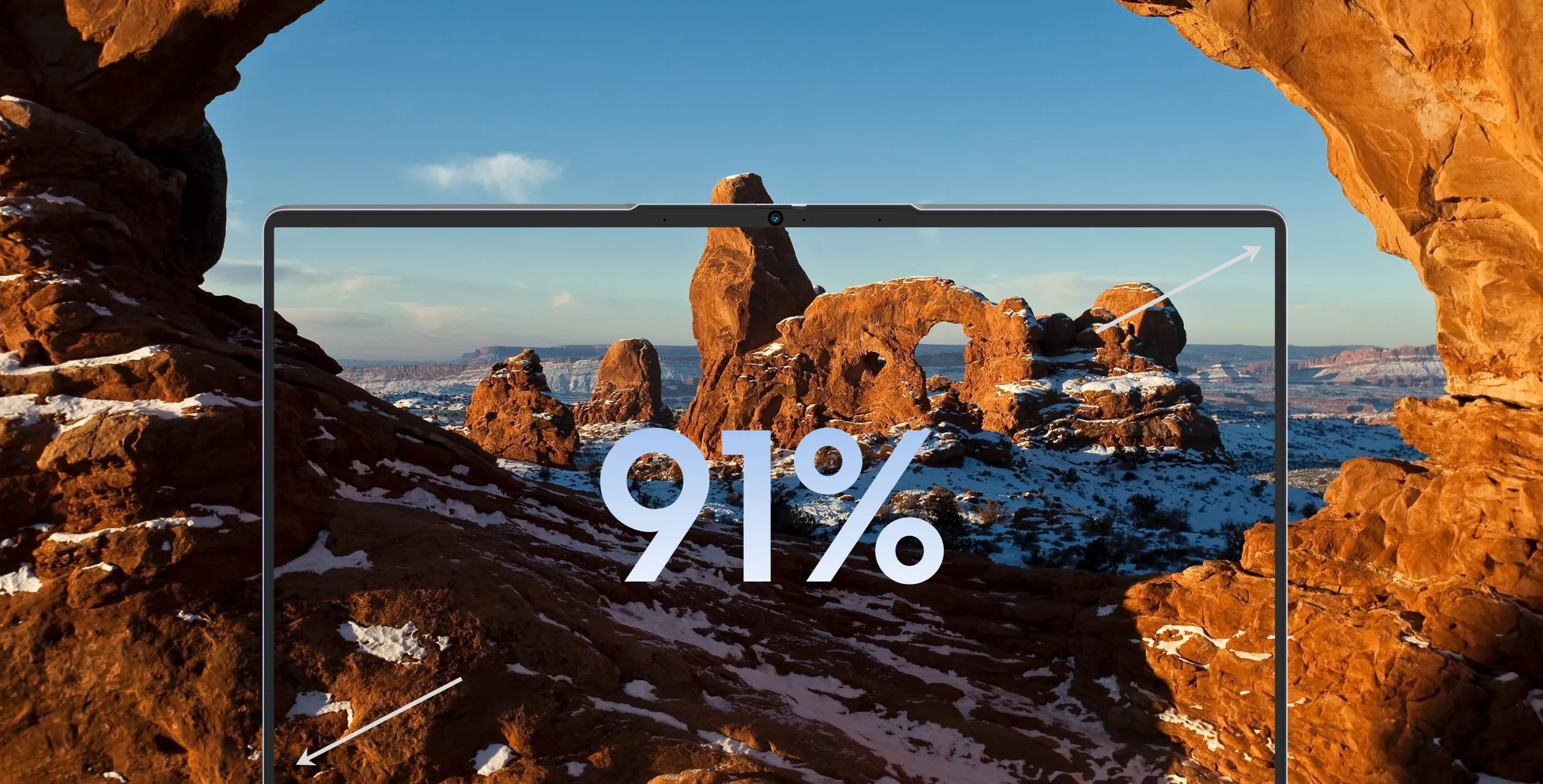 Соотношение сторон экрана 16:10 обеспечивает широкий визуальный охват, а соотношение площади экрана к корпусу 91% делает дисплей практически безрамочным.