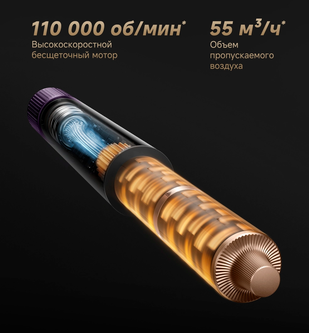 Сочетание высокоскоростного воздушного потока и сильно сжатого выходного отверстия для воздуха создает плавный и мощный поток воздуха, который бережно обволакивает каждую прядь и придает волосам форму, делая прически надолго гладкими и блестящими, предотвращая при этом спутывание.